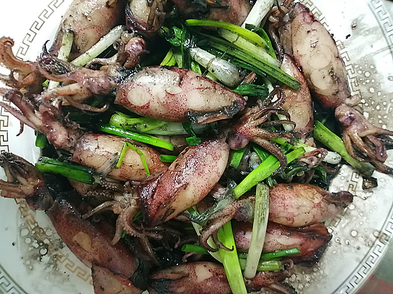 先将鲜鱿鱼开水灼熟,起油锅,先放姜,再放鱿鱼,轻翻焗一会,再放葱条、鲜味酱油或你喜欢的酱料,轻翻几下即可。