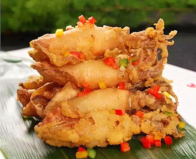 5、椒盐鲜鱿鱼:椒盐粉料开好水调好,鲜鱿鱼酥粉油炸金黄色即可。